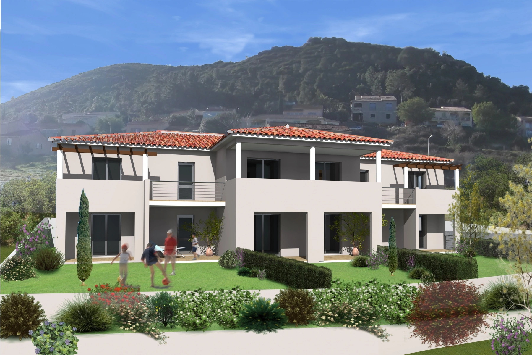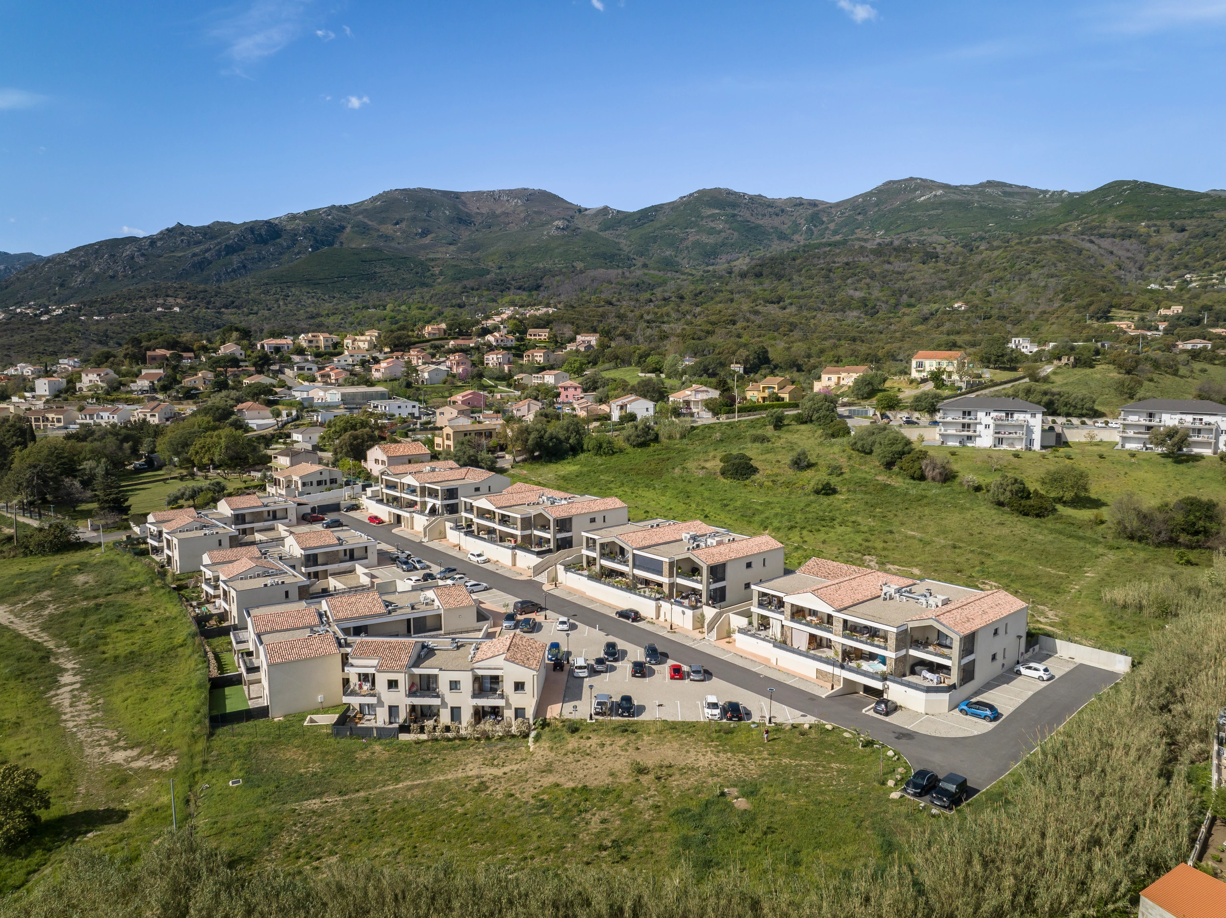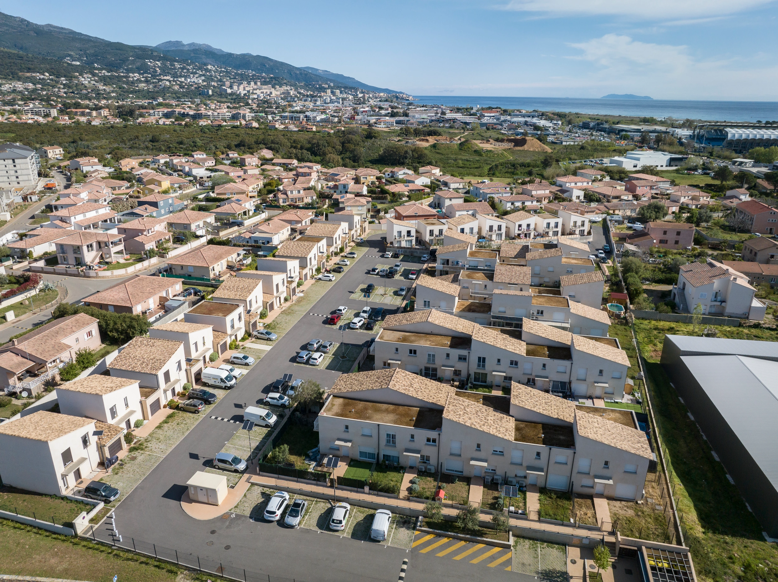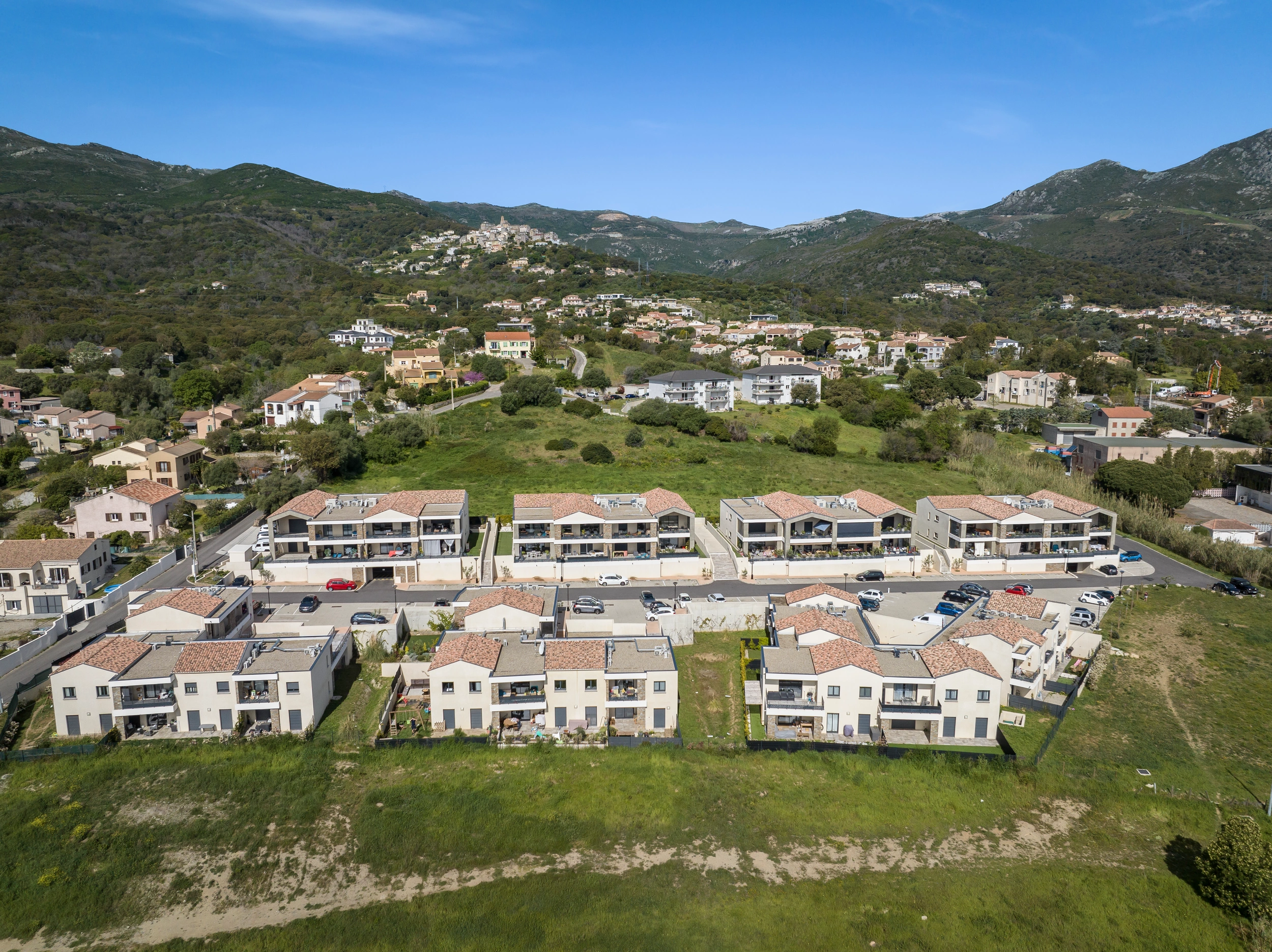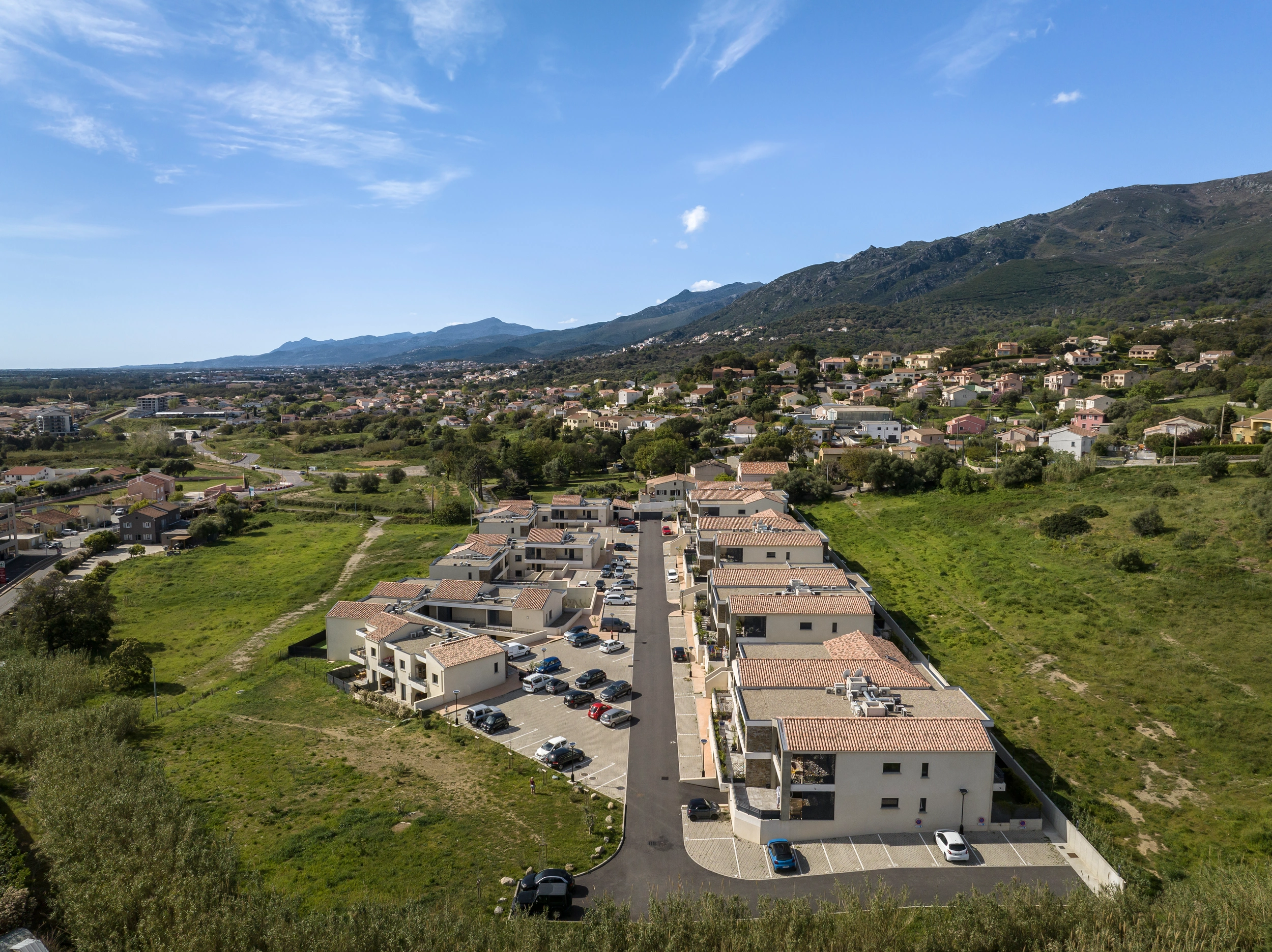 Opération mixte - 20 villas duplex avec garage et jardin pour primo-accédants et 6 bâtiments d'un étage de 48 logements sociaux. Ensemble allant du T2 au T4 sur la commune de Furiani.