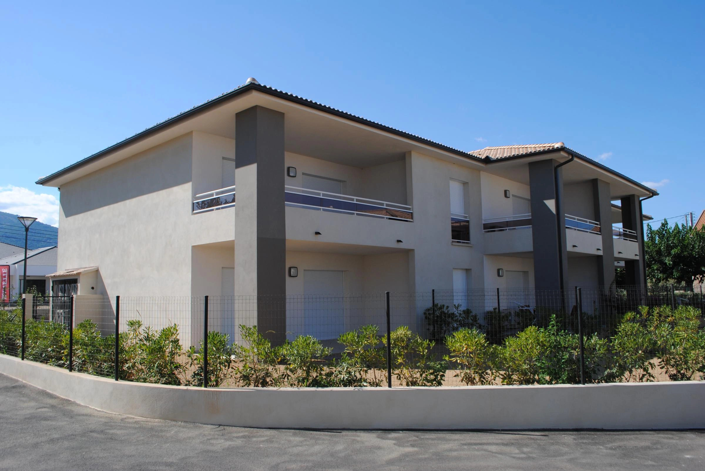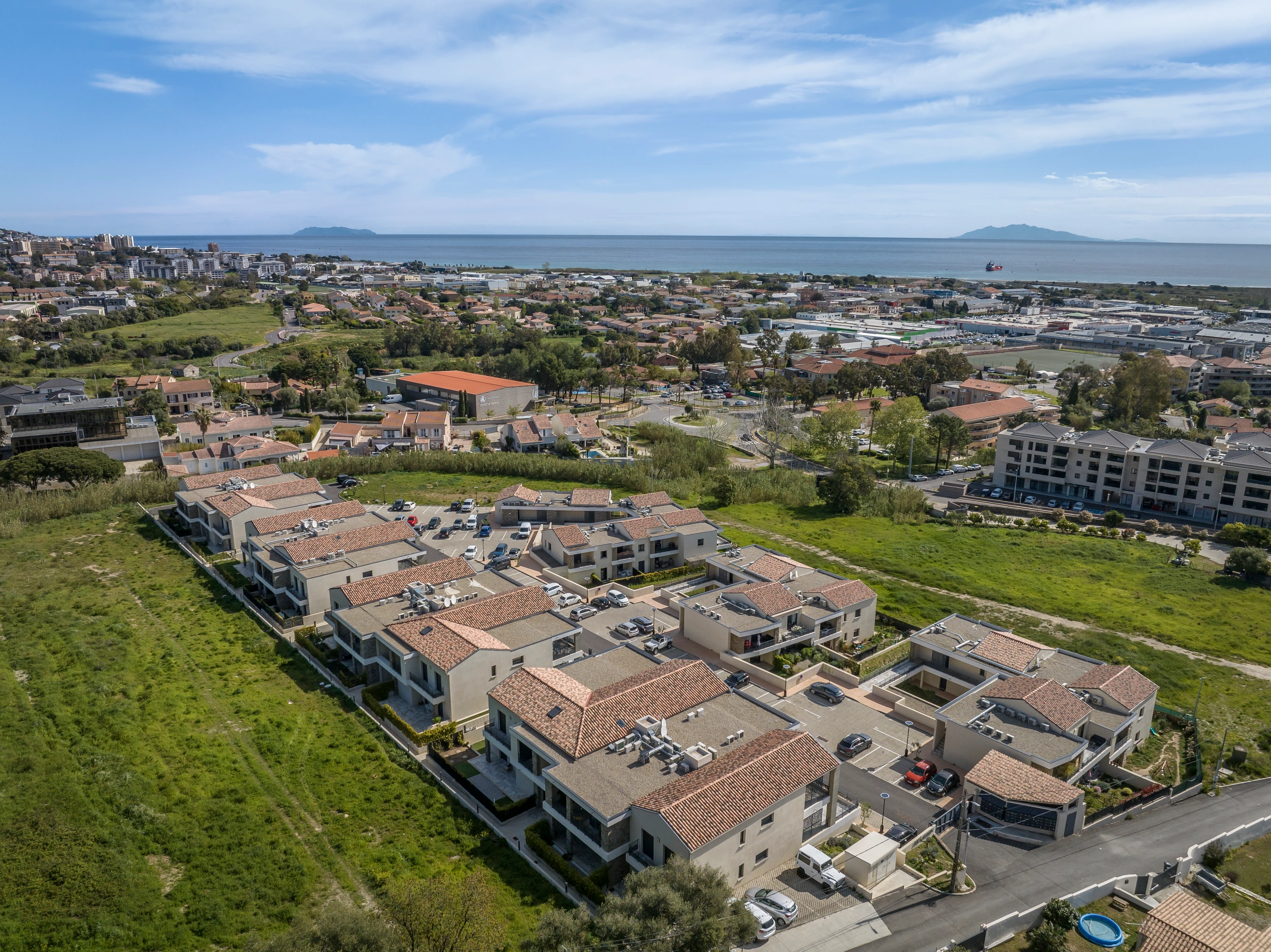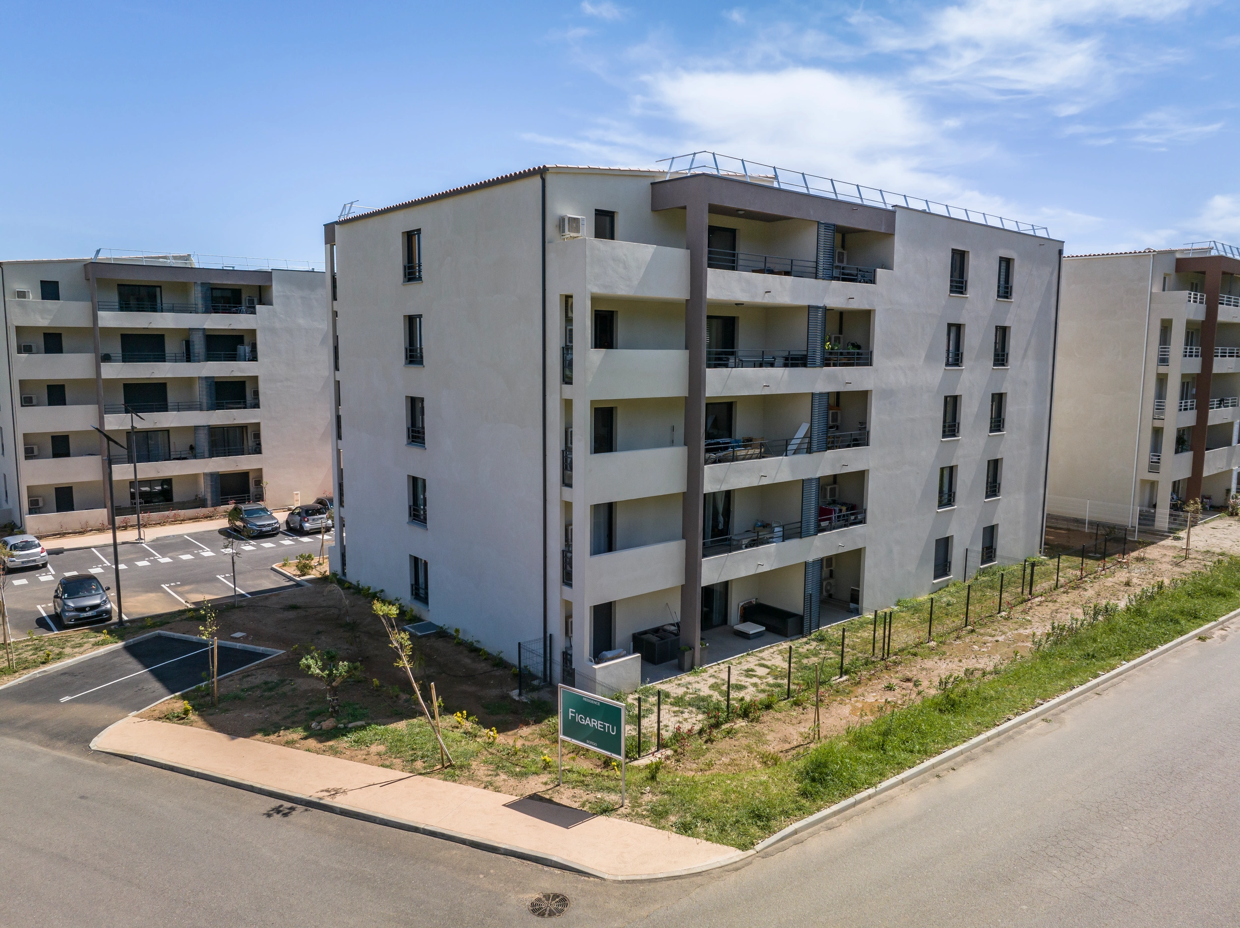 Opération de 99 logements répartis sur 6 bâtiments en R+2 et R+3, 16 commerces en pied d'immeuble et 256 stationnements extérieurs. 24 logements destinés à logements en LLS. Ensemble allant du T1 au TT4, sur la commune de Furiani.